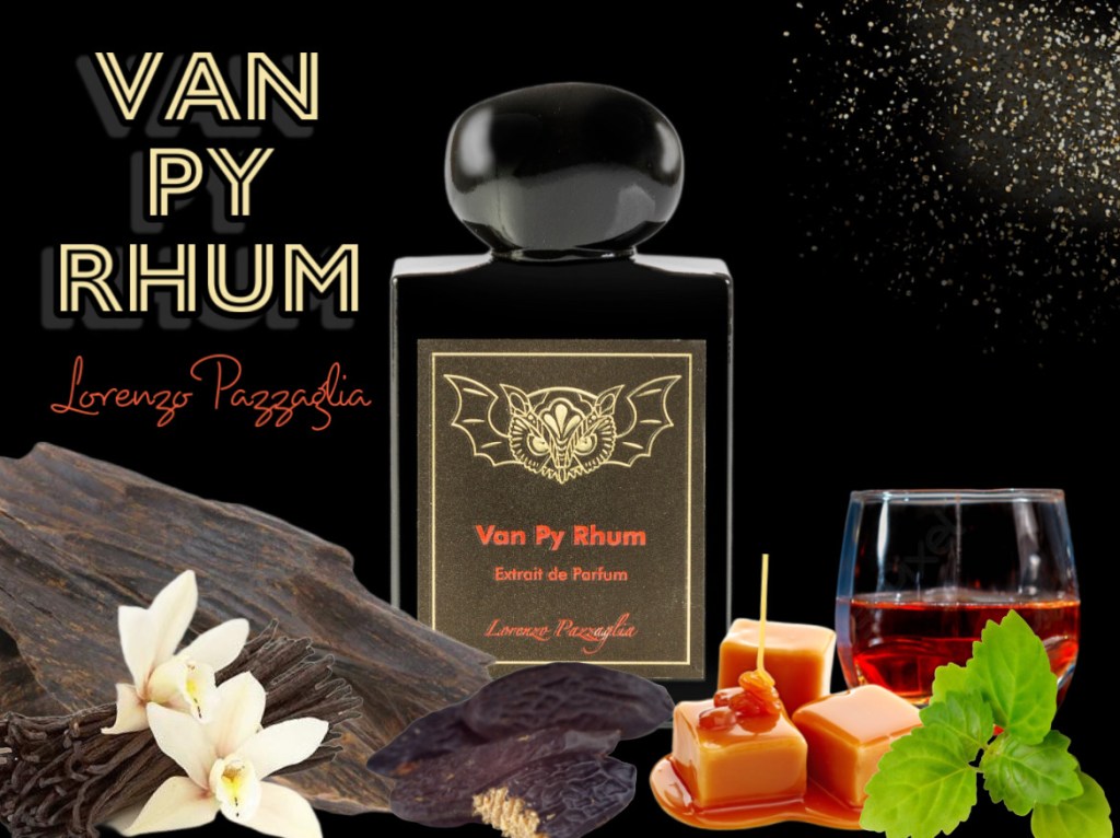 In Van Py Rum di Lorenzo Pazzaglia gocce di rum scivolano su di un letto di morbida vaniglia ed è musica languida fatta di un patch ombroso che danza tra fiori bianchi in un sospiro, che racconta una storia fatta di calda eleganza. Una fragranza vanigliata che si apre con le migliori qualità di vaniglia del Madagascar, fava tonka e rum. Un cuore di caramello, patchouli e fiori bianchi distesi su un fondo di agarwood e patchouli indonesiano.