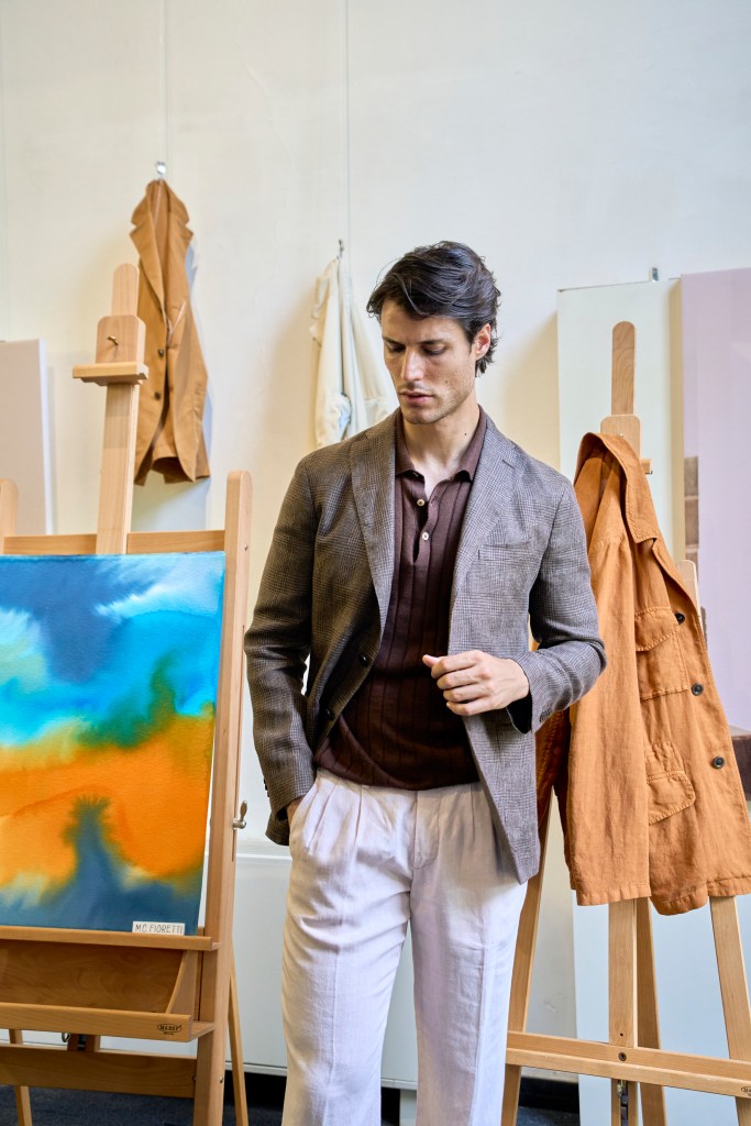Tra i capi più rappresentativi, la giacca super light realizzata in lana extra fine e seta tinto in capo, con una lavorazione speciale che le conferisce una leggerezza straordinaria e assoluta, di soli 240 grammi. E la giacca sartoriale napoletana – progettata in collaborazione con alcune maestranze – dal taglio sartoriale, confortevole, pratica e resistente. Due pezzi unici che evidenziano la maestria Boglioli nella realizzazione di capi destrutturati e soft tailoring.