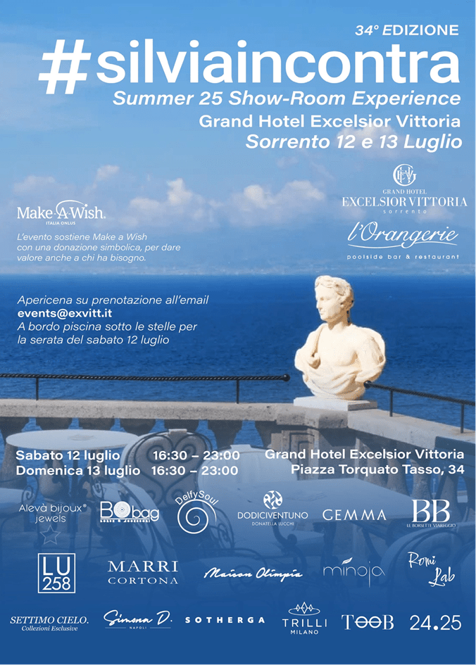 ‘SilviaIncontra’, format di successo che promuove le artigianalità del Made in Italy creato dalla seguitissima influencer e imprenditrice Silvia Berri, arriva a Sorrento per una tappa estiva in una delle località più belle e iconiche d’Italia. L’edizione numero 34 del pop up event del fashion italiano sarà in scena sabato 12 e domenica 13 luglio nel prestigioso e lussuoso Grand Hotel Excelsior: sabato e domenica dalle 16.30 alle 23.