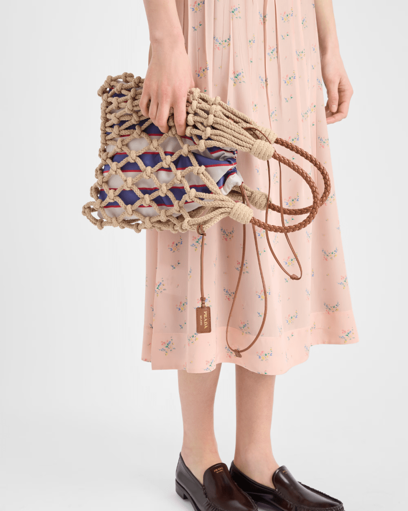 Prada riscopre il fascino della manualità con la Noué Medium, realizzata in corda di cotone intrecciata. Il design elegante ma rilassato richiama il mondo nautico, in perfetto equilibrio tra lusso e artigianalità. Un must per le esteti del minimalismo chic.