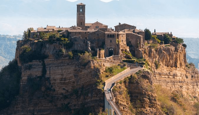 Soprannominata “la città che muore”, Civita di Bagnoregio è un piccolo borgo medievale situato su un colle di tufo che si erode lentamente sotto l’azione degli agenti atmosferici. Fondata dagli Etruschi oltre 2.500 anni fa, fu un tempo un centro fiorente, ma a causa dei continui terremoti e delle frane fu progressivamente abbandonata. Oggi è raggiungibile solo a piedi tramite un ponte pedonale sospeso. Passeggiando tra i suoi vicoli in pietra, si respira un’atmosfera sospesa nel tempo. Il borgo è anche un importante simbolo della fragilità del patrimonio storico italiano.