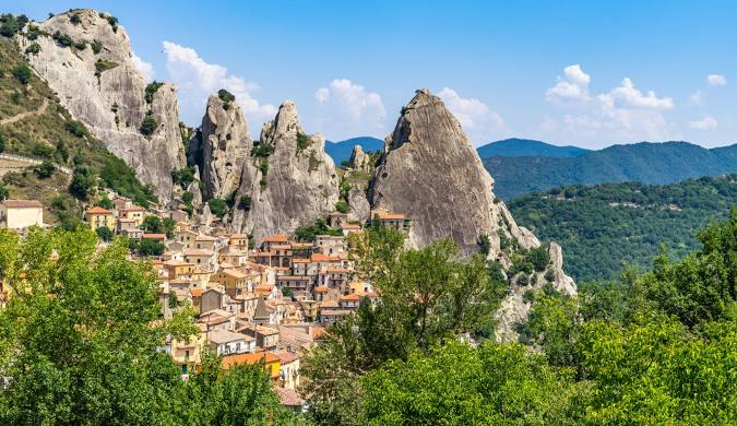 Castelmezzano è uno dei borghi più affascinanti delle Dolomiti Lucane. Fondato dai Normanni nell’XI secolo come avamposto militare, il paese si distingue per le case incastonate nella roccia, quasi mimetizzate con le montagne circostanti. Il nome deriva dal latino “Castrum Medianum”, ovvero “castello di mezzo”. Qui il paesaggio è protagonista, con vette aguzze che ricordano una skyline naturale. Oggi è famoso anche per il “Volo dell’Angelo”, un’emozionante attrazione che collega Castelmezzano al vicino borgo di Pietrapertosa, sospesi a oltre 1000 metri d’altezza.