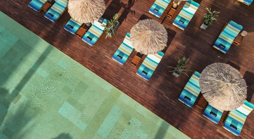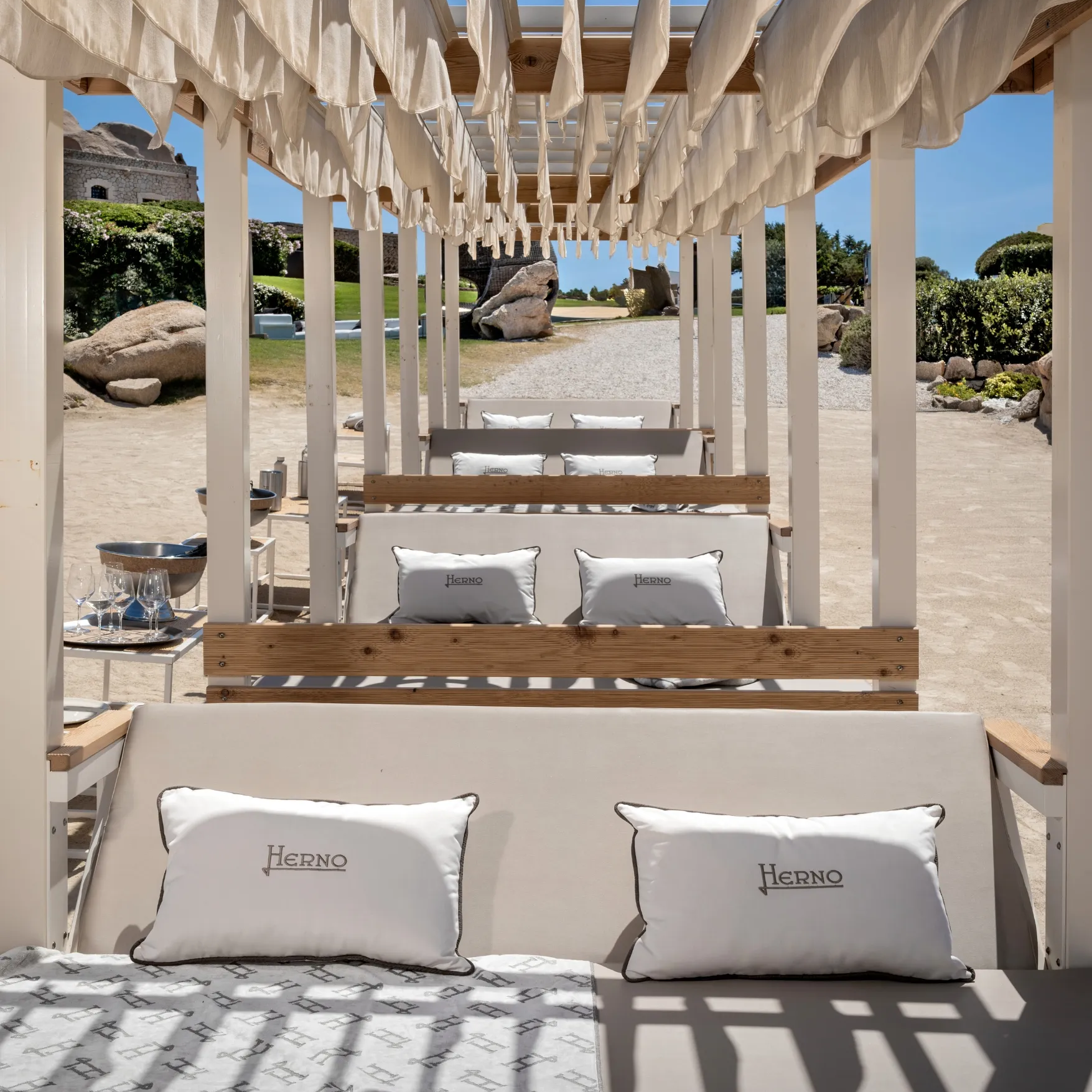 I toni neutri del kummel e del bianco avvolgono lettini, cuscini e ombrelloni in un’armonia materica tipica del brand.