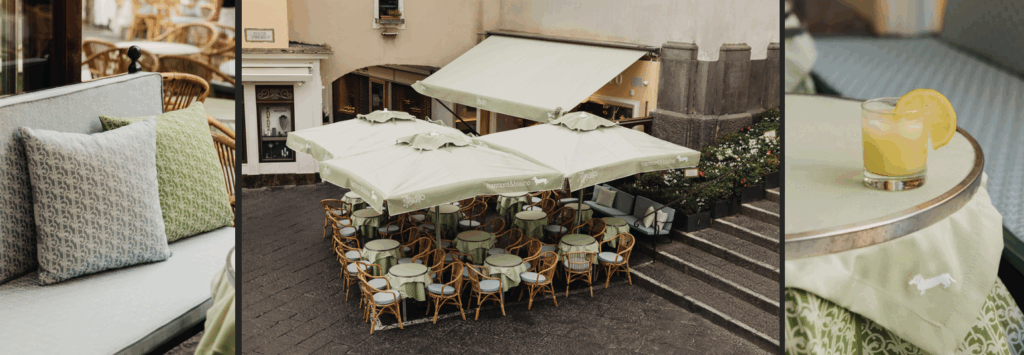 Brand napoletano nato nel 1995, Harmont & Blaine veste Bar Tiberio nella celebre Piazzetta di Capri. Tende, sedute e mise en place raccontano la solarità partenopea del brand. Anche lo staff indossa capi esclusivi della collezione.