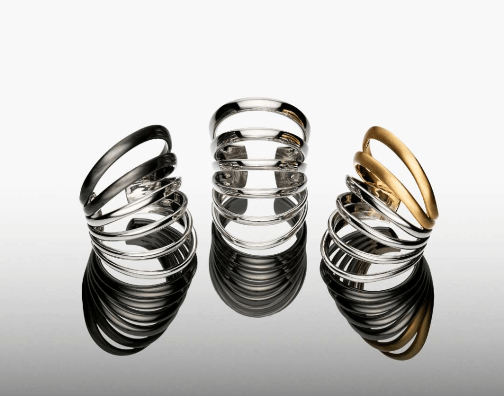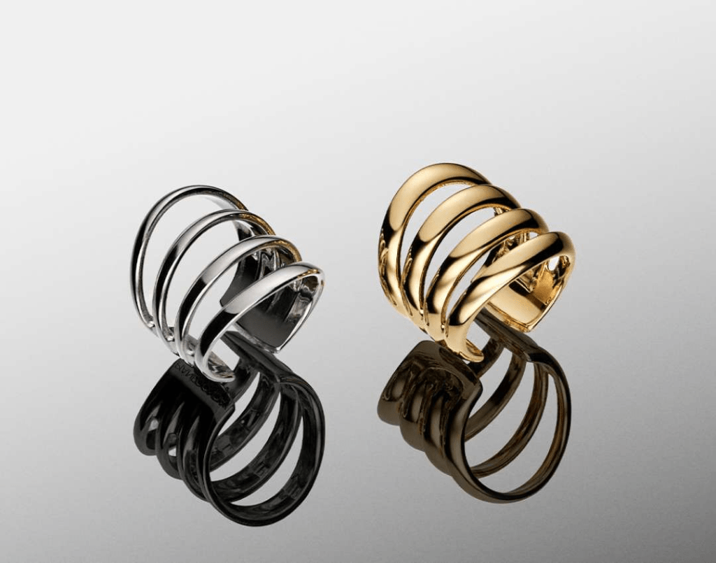 Il primo drop, già disponibile, comprende anelli e earcuff in argento 925, ottone e galvaniche oro, rutenio e argento. Gioielli dal design architettonico, con linee concentriche e volumi audaci che evocano movimento, energia e libertà di espressione. Le curve sinuose, i contrasti tra pieni e vuoti e i rimandi all’architettura moderna interpretano il corpo femminile come scultura viva, trasformando i codici minimalisti in statement pieces da indossare ogni giorno.