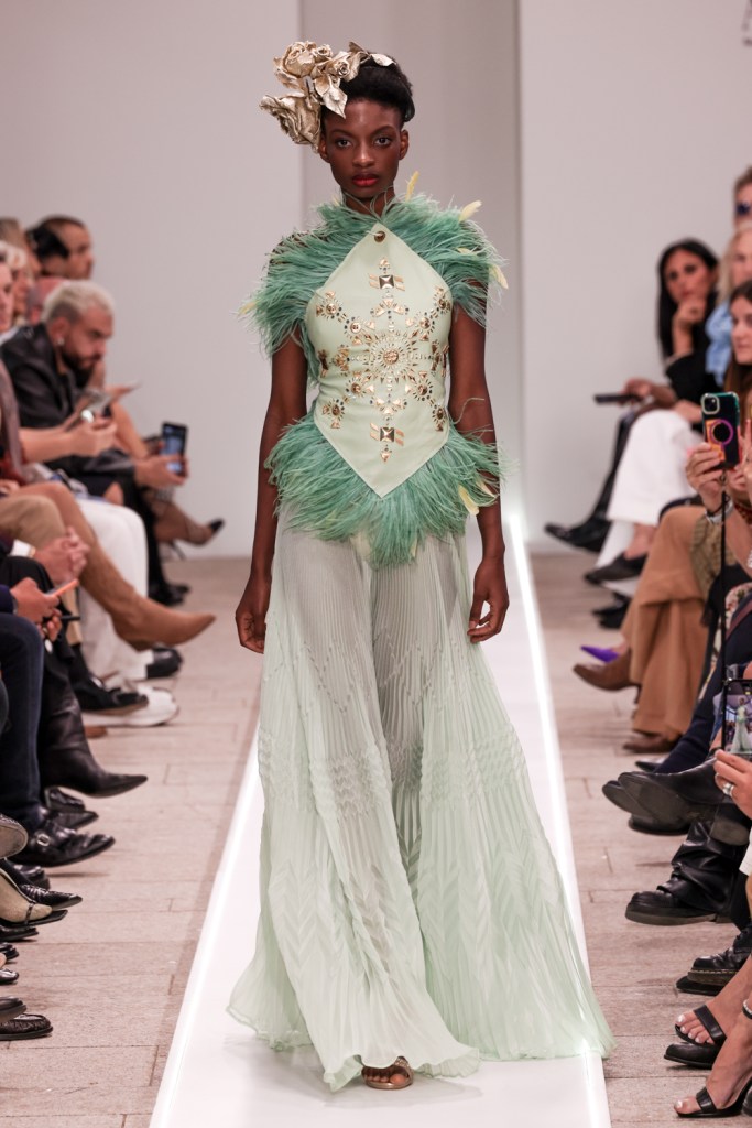 Il linguaggio creativo di Anton Giulio Grande si esprime qui in una dimensione ancora più matura e ispirata: la pelle, materia prima protagonista grazie al supporto di Lineapelle, viene nobilitata da lavorazioni haute couture, ricami con piume, strass, swarovski, inserti geometrici e sorprendenti contrasti cromatici. La palette spazia dal nero intenso – cifra distintiva dello stilista – a tonalità pastello che si aprono in una vera e propria “ruota” di plissé geometrici, toccando nuance come il bluette, il verde acqua, il celeste.