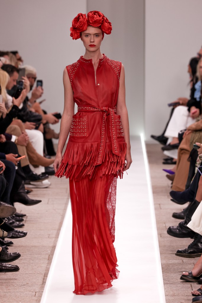 Grande attinge all’estetica kahloiana con profondo rispetto e originalità: gonne lunghe in stile gipsy con frange di pelle e cristalli, balze in pizzo, rouches in organza, corpini asimmetrici in cavallino, camoscio e pelle, evocano lo spirito anticonformista dell’artista messicana, senza mai cadere nell’imitazione. Particolare menzione merita il giubbotto di pelle con l’immagine della Kahlo, vero e proprio manifesto visivo della collezione.