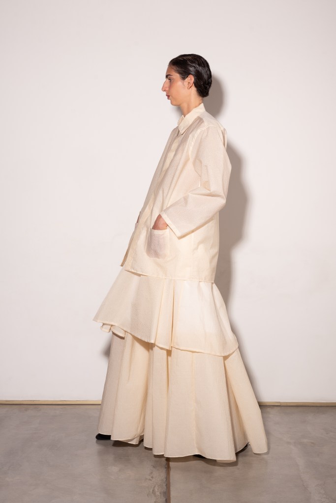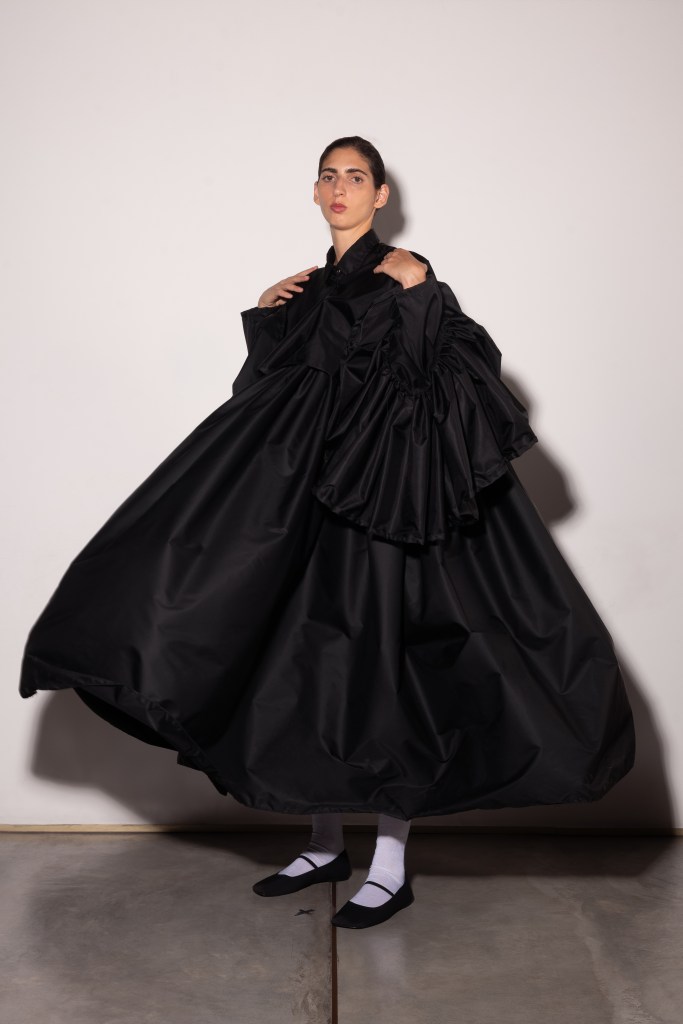 I capi combinano seta e tessuti tecnici, tagli sartoriali e volumi funzionali. L’estetica è quella del “clericale ribaltato”, cifra distintiva del brand: abiti come luoghi, non come status. Lontani dal concetto di lusso fine a sé stesso, gli outfit diventano investimenti etici, oggetti duraturi che custodiscono tempo, relazioni, artigianato.