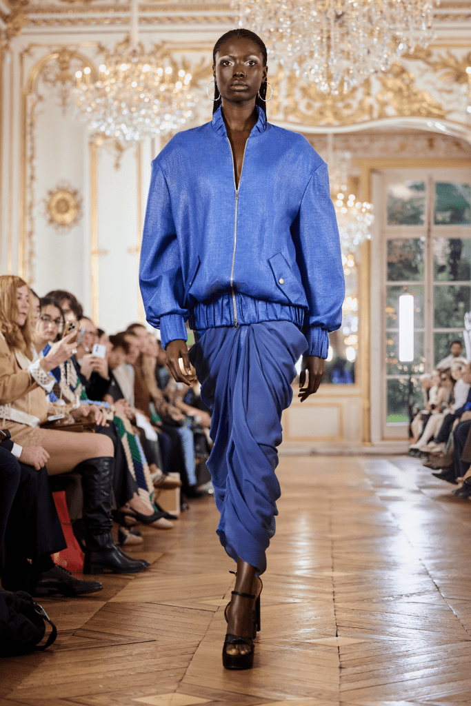 Le onde sono un leitmotiv ricorrente: nelle frange tagliate al laser, nei volants in organza, nei drappeggi asimmetrici che modellano la figura con leggerezza. I materiali — seta, cotone, lana, pelle e lino — dialogano tra loro per creare texture nobili e dinamiche, espressione di una sensualità mai ostentata ma sempre presente.