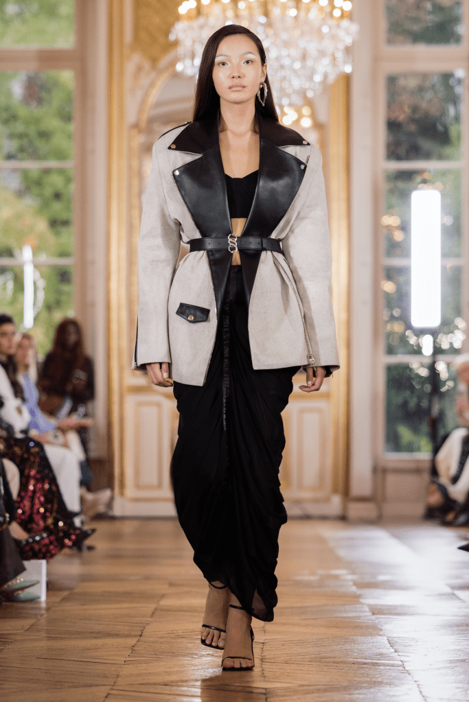 Elemento chiave della collezione è la tecnica del nuovo drappeggio “Falling Folds”, che ammorbidisce le linee nette del taglio sartoriale tradizionale. Che si tratti di un blazer che avvolge con eleganza o di un lungo abito fluido che accarezza i fianchi, ogni capo sembra catturare il movimento, come un tessuto sospeso tra il vento e il mare.