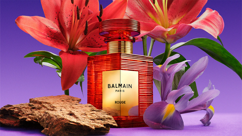 Rouge, invece, guarda verso l’esterno. È il profumo del desiderio, dell’attrazione per la luce e per il successo, ispirato al legame profondo che unisce Balmain al mondo dello spettacolo e dell’immaginario pop. La sua composizione floreale-fruttata si apre in modo avvolgente e sensuale, con la lily e la moraea ciliata che si intrecciano alle sfumature vellutate dell’osmanthus. Il cuore si scalda progressivamente fino a trovare nel georgywood, nello ylang-ylang e nella magnolia una scia luminosa, magnetica, quasi cinematografica. Rouge è l’amore che crea dipendenza, quello per la propria immagine, per il proprio potenziale, per il momento in cui tutto sembra possibile.