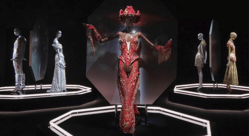 Simbolo assoluto della Maison, la Medusa rappresenta il cuore concettuale della poetica versaciana. Ispirata all’immaginario apotropaico dell’antichità, diventa emblema di seduzione, forza e bellezza pericolosa. In mostra, la Medusa attraversa abiti, gioielli, bottoni e oggetti di design, dimostrando come Versace abbia saputo trasformare il mito in identità visiva universale.