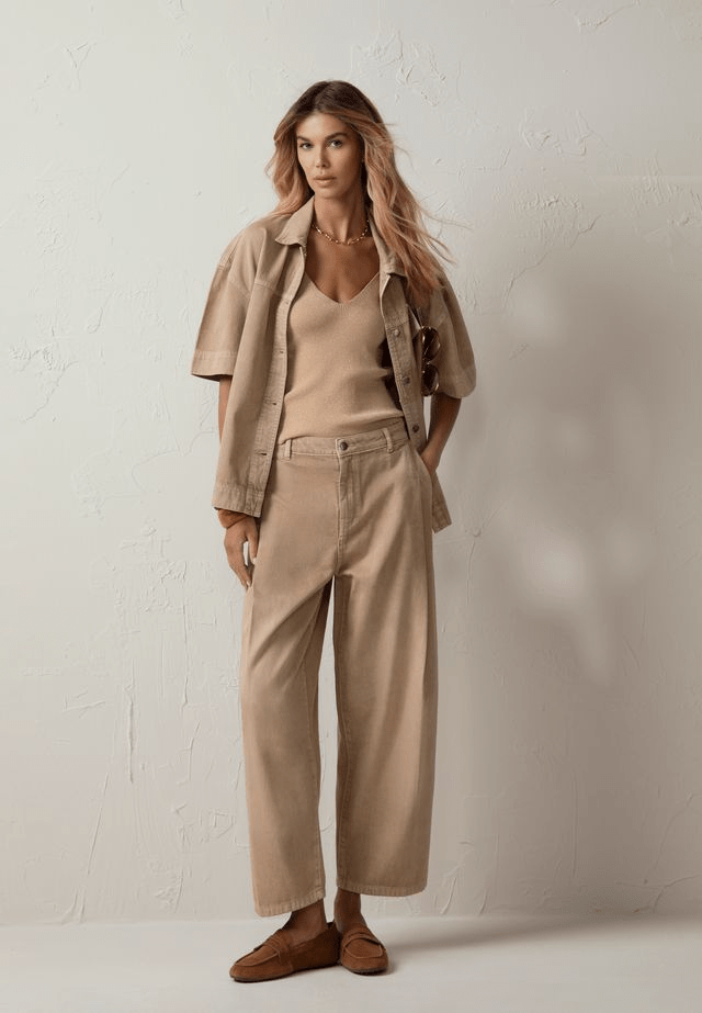 Più disinvolta ma altrettanto consapevole è la femminilità che emerge dagli outfit che combinano camicie leggere e denim dal taglio ampio. Qui entra in gioco lo spirito di Dimensione Danza, brand che da sempre porta nel quotidiano un’idea di moda ispirata al movimento e alla libertà del corpo. I volumi seguono il gesto, i tessuti accompagnano, costruendo un’estetica casual chic che parla di energia, dinamismo e autenticità.